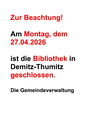 Zur Beachtung! Die Bücherei bleibt am 27.04.2026 geschlossen